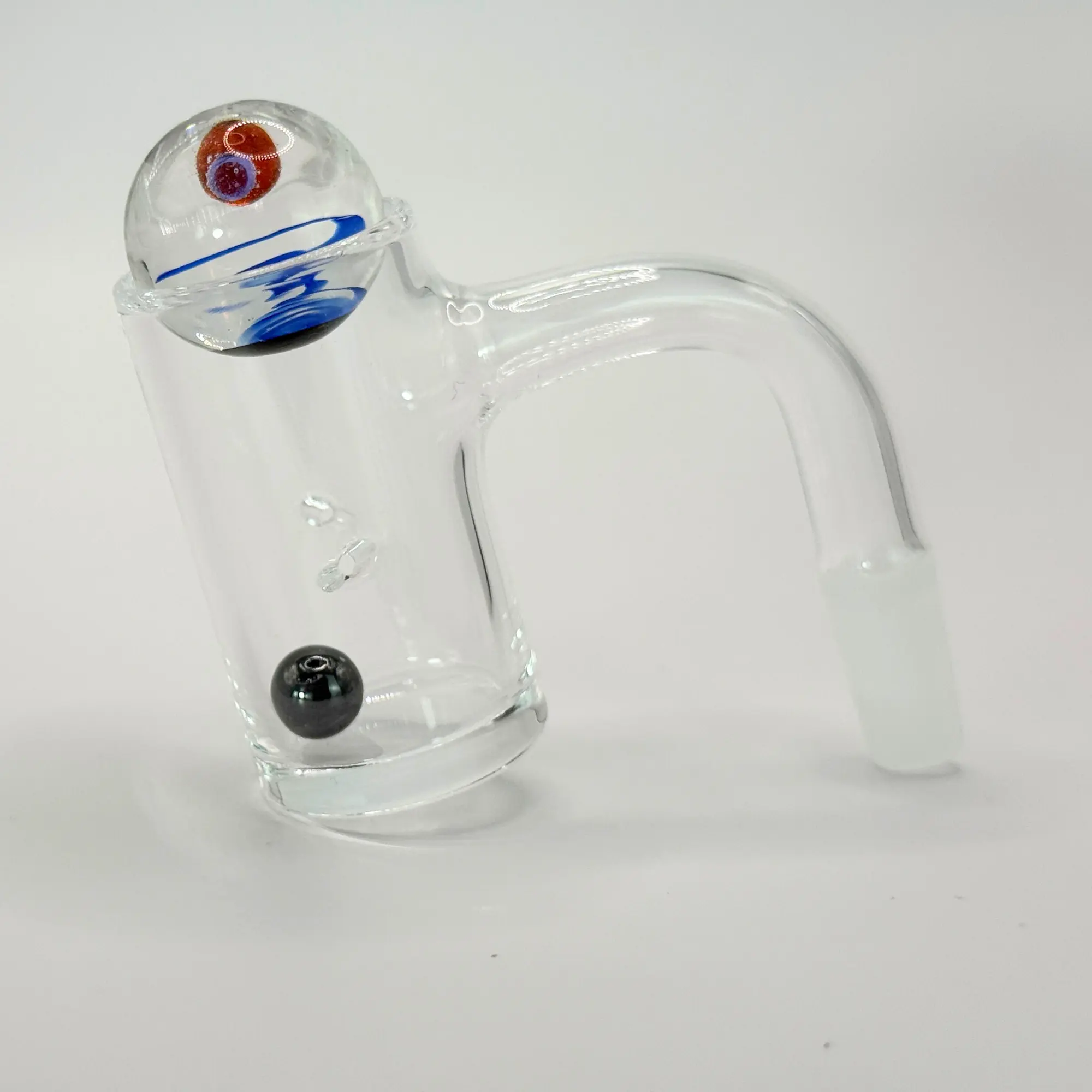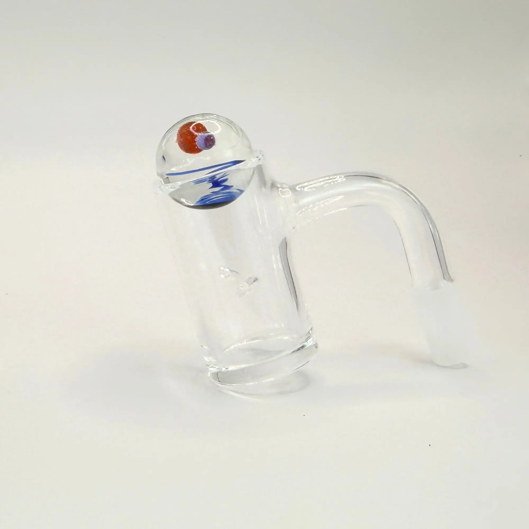 The 25mm auto spinner banger utilizes two precision-drilled directional airflow holes strategically placed in the bucket walls. As you inhale, these holes create a powerful vortex that catapults your terp pearl up the bucket walls (depending how hard you pull!), spreading concentrate evenly across the heated surface for superior vaporization. No messing with the carb cap. Just drop your dab, cap it with the included marble, and watch the magic happen.