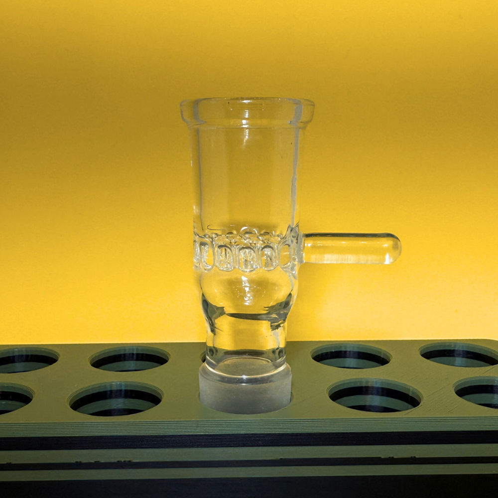 Simple. No Passthrough. The Glass Injector Bowl delivers a solid value offering for those wanting glass purity in their bowl. Designed for use with the Ruby Twist Injector or Wireless One-Hit Wonder, and even now the Universal Baller V2 with their injector adapter, it offers an enjoyable flower consumption experience for even more ball vapes with 18mm injector heads. What it comes down to is having more options than the Titanium Hybrid bowl when you’re wanting to pack more in at once. Comes in only an 18mm male connection. If you want a more versatile option with passthrough and 14mm male, check this listing.