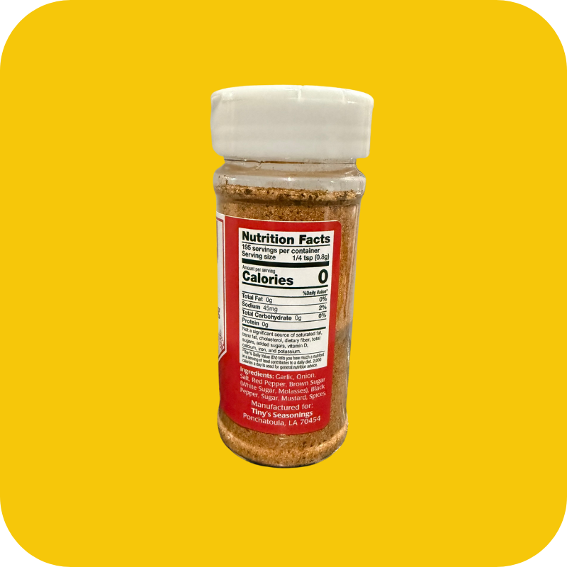 With only 45mg of sodium, you can keep your vibe salty-free while still bringing the heat. Perfect for seafood, meat, or, let’s be real, anything you can find in your fridge at 2 a.m. So don’t just salt your food—season it with Tiny’s Cajun and let your taste buds party.