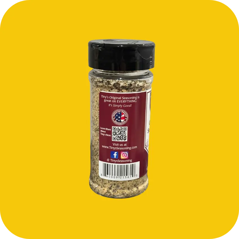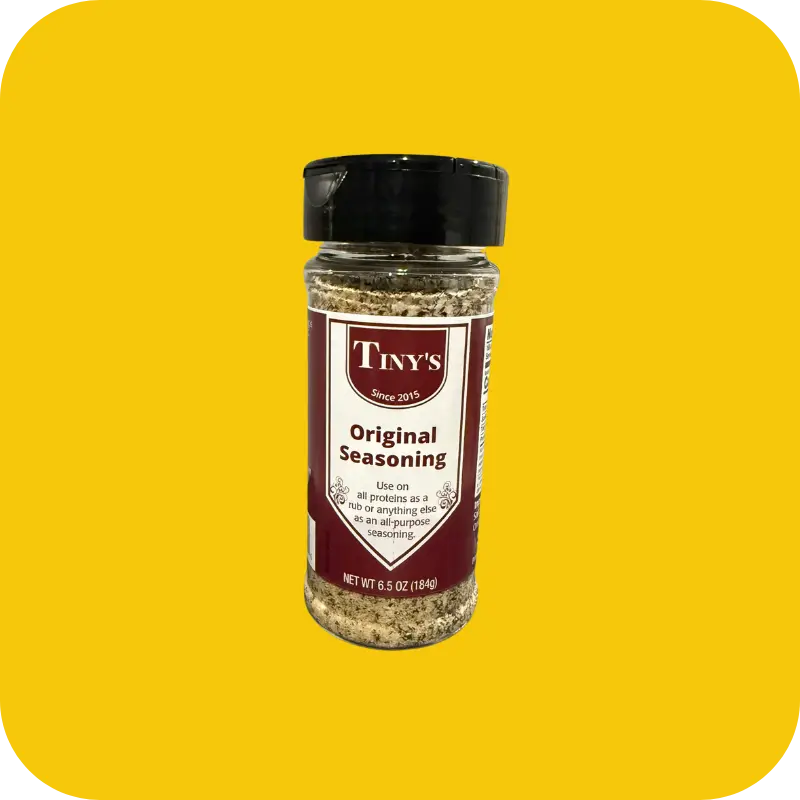 Unleash the flavor with Tiny’s Original Blend—a masterful mix of spices crafted to elevate any dish. Whether you’re grilling, roasting, or just sprinkling on your favorite snack, this seasoning is your go-to kitchen companion. Designed to enhance all proteins as a rub or as an all-purpose flavor booster, it adds a bold and savory kick to every bite. Comes in a 6.5oz bottle.